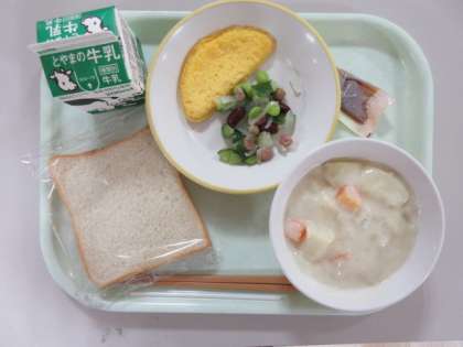 本日の献立は、食パン、オムレツ、ミックスビーンズのマリネ、クリーム煮、メープルジャムでした。