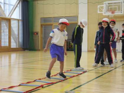 2年生は、体育の時間に「チャレンジキッズ わざ7」に取り組んでいました。この時間はラダーを使って、細かくて速い足の動きに挑戦していました。