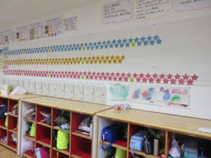 1年生は、毎日帰りの会に、友達のすてきなところ(スター)を見つけています。毎日のスターを教室に掲示し続けて、こんなにたくさんになりました。おかげで、1年生は自分への自信が育っているようです。