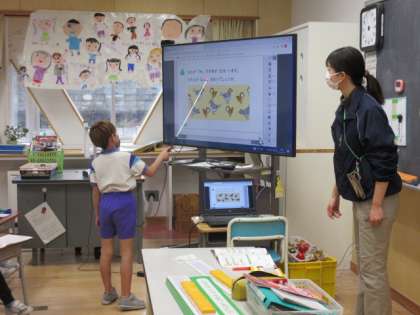 1年生は算数の時間、ひき算の文章題に取り組んでいました。問題をよく読んで、式を立てるためのポイントを学んでいました。子供たちは、積極的に手を挙げてがんばっていました。
