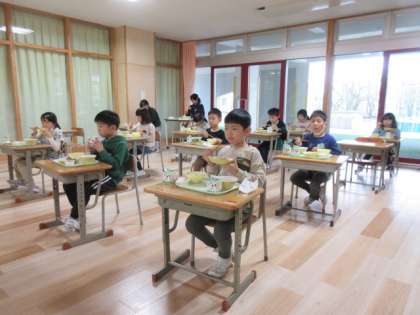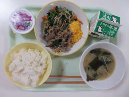 本日の献立は、ごはん、ビビンバ(焼き肉、ナムル、錦糸卵)、みそ汁、ぶどうゼリーでした。
