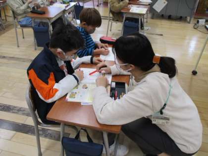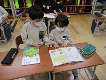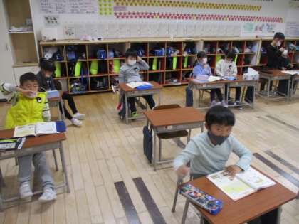 1年生の1時間目は算数の授業でした。学習していた内容は、繰り下がりのある「2桁」−「1桁」のひき算でした。まだまだ指を折って数えている段階の様子も見られましたが、算数カードを使って練習を繰り返すことで、どんどん慣れていってほしいと思います。