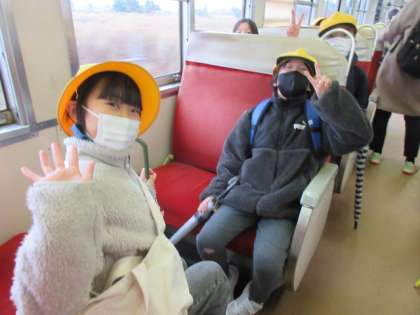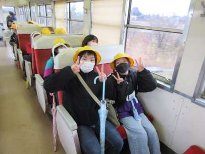上滝駅から電車に乗って、富山駅に向かいます。みんな仲良く語り合っています。