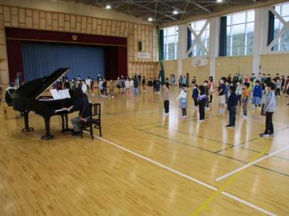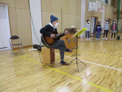 11・12月の歌「世界がひとつになるまで」を、全校で歌います。6年生が集まって力強い声を響かせ、特別ゲストさんがギターで伴奏してくださいました。