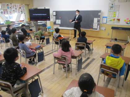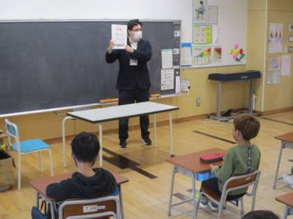 4時間目の1年生は、ALTの先生といっしょに英語のお勉強です。今日の学習は、動物の名前からスタートです。ネコ、イヌ、トラ、ニワトリなどは、何となく英語でどう表すか分かりそうですが、ALTの先生が見せた絵にはイノシシのイラストがありました。皆さん、ご存じですか?