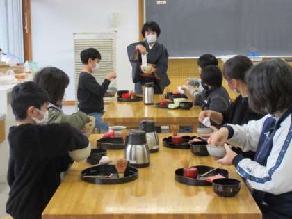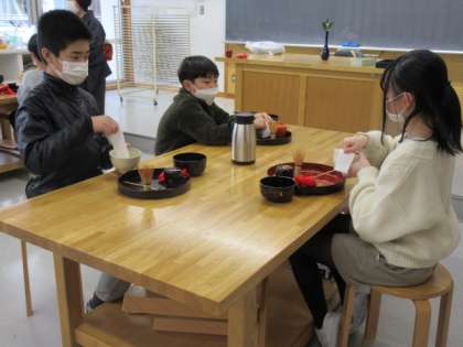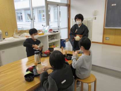 先生と一緒に、作法を守ってお茶をいただいている様子です。真剣に、静かに取り組んでいました。