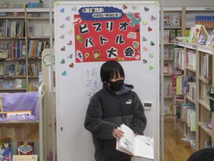 12月8日(木) 図書委員が行った「ビブリオバトル」3 公開日 2022/12/08 更新日 2022/12/08 職員室から エントリーナンバー2番。紹介する本は「かいけつゾロリ・ラーメンたいけつ」です。