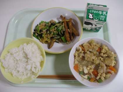 今日の給食献立は、ご飯、牛乳、きびなごのから揚げ、納豆和え、親子煮 でした。