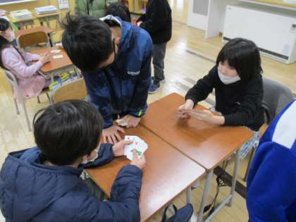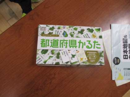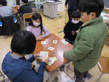 朝の時間に4年生教室を訪れると、楽しげな笑い声が聞こえてきました。「何をしているのかな」と見てみると、3つのグループに分かれて、トランプの様なゲームに熱中していました。そのカードゲームは3種類あって、「都道府県かるた」「四字熟語かるた」「ご当地キャラクターかるた」でした。楽しみながら復習ができるのはいい方法です。