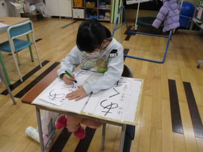 ひまわり級では、朝の時間に書き初めの練習をしました。できた作品には名前も書いて、廊下に掲示しました。