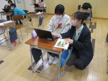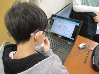 2時間目の5年生は、算数の授業でした。平行四辺形の面積をどうやって求めるのかを考えるのがこの時間の課題です。考えをまとめるのにはクロームブックを使います。もとの図形を切ったり移動したりできますし、必要な情報も書き込むこともできます。また、自分の考えは、みんなで画面を共有して伝えることもできます。昭和の時代に学んだ私には驚きです。