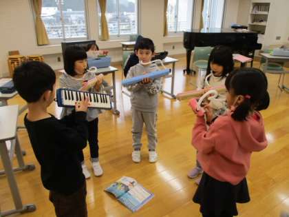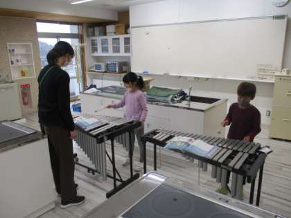 3時間目の1年生は音楽の授業でした。この授業では、音楽室周辺で「きらきらぼし」の演奏練習をしました。鍵盤ハーモニカのグループは音楽室を使い、鉄琴のグループは家庭科室を使って練習をしました。