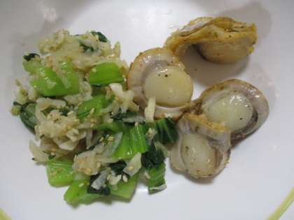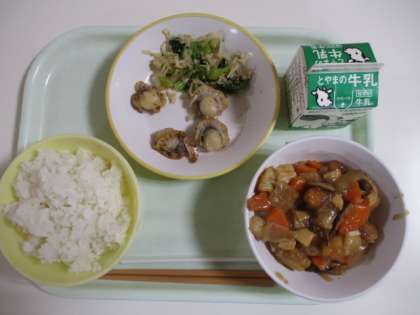 今日の給食献立は、ご飯、牛乳、酢豚、ホタテの香味焼き、はりはり和え でした。