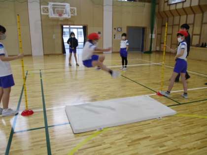3・4年生の5時間目は合同の体育でした。今日も体育館を使って、走り高跳びの練習をしました。
