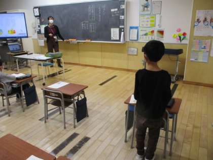 5時間目の1年生は国語の授業でした。教科書にある「ものの 名まえ」という学習では、名前を「まとめてつけた名まえ」と「一つ一つの名まえ」に区別しました。例を挙げれば、トマト・ニンジン・タマネギなどは「一つ一つの名まえ」で、それらをまとめて表した「やさい」は「まとめてつけた名まえ」になります。