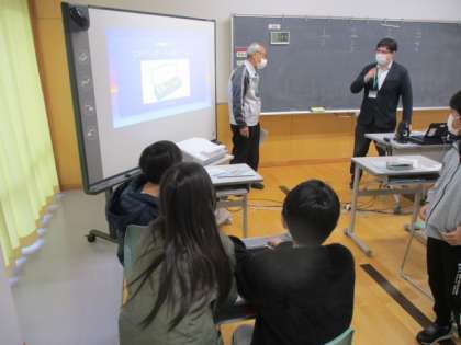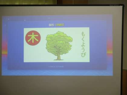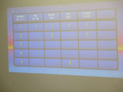 まず、クラスを4グループに分け、それぞれのグループで英語の問題に答えていき、その獲得ポイントを競い合います。問題選びは点数によって難易度が違ってきます。「あいさつ」「食べ物」「天気」「曜日」「文房具」の5つのカテゴリーで、1点から5点問題が選べます。(写真中)3枚目の写真は「もくようび」を英語で答えるものです。比較的簡単な問題ですから、正解しても高得点はゲットできません。