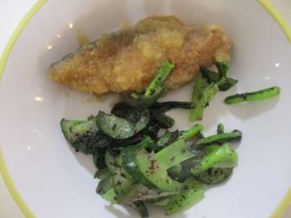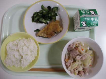 今日の給食献立は、ご飯、牛乳、フクラギのみぞれかけ、ゆかり和え、白菜鍋 でした。