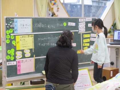 教科は国語。以前にあった出来事をもとに、4〜5文の日記を書くという内容です。この授業には、至る所に支援の手立てが施されており、他の教室で行われる授業にとっても学ぶことがたくさんありました。