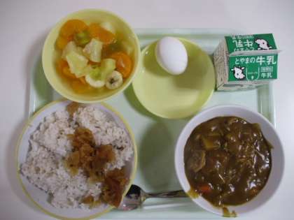 今日の給食献立は、カレーライス(麦ご飯)、牛乳、ゆで卵、福神漬け、フルーツゼリーミックス でした。