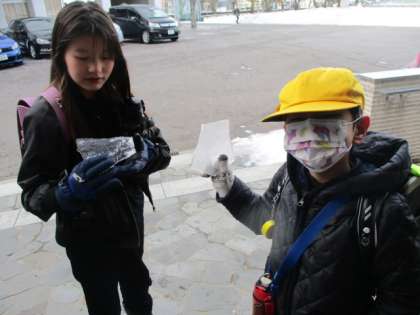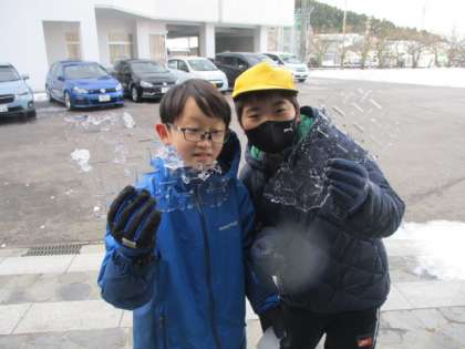 さて今朝は、とても冷え込みました。今年一番の寒さではないかと思う程です。おそらく放射冷却のためでしょうが、この寒でさえ子供たちの手にかかると「遊び」の一環に組み込まれてしまいます。登校途中でも、登校してからも、子供たちは面白いことを探し出します。氷と化した雪の小山に登るとか、パリパリの雪の上を歩くとか、中でも今日の話題の中心は「氷」でした。いろんな所で探し出してきた「お宝」を見せてくれました。