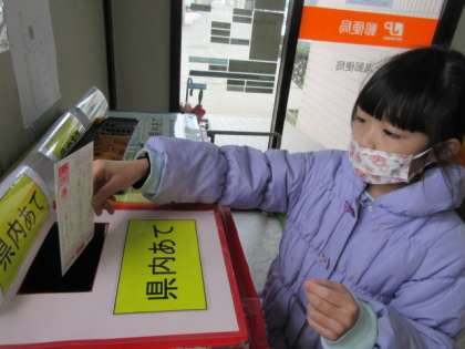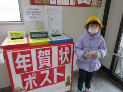 給食の記事と時間が前後しましたが、今日の午前中にひまわり級では、これまでに書き上げてきた年賀状を、郵便局まで投函に行ってきました。送り先は、交流のある大庄小学校のお友だちや、3月にひまわり級を卒業していったおねえさんです。