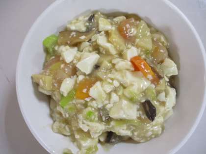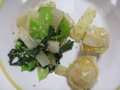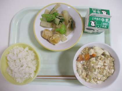 今日の給食献立は、ご飯、牛乳、ニンジンシューマイ、大根ナムル、エビと豆腐のうま煮 でした。
