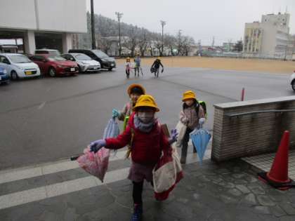今日から3学期がスタートです。小雪がちらつく中、子供たちは大きな荷物を持って元気に登校してきました。
