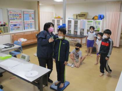 今朝は、1年生から3年生が順番に、身長・体重を測る「発育測定」と視力測定を行いました。