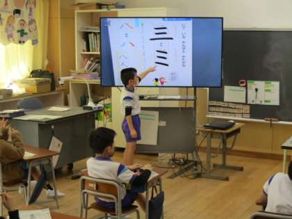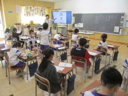3時間目の1年生は書写の授業でした。教室をのぞいた時には、漢字の「三」とカタカナのの「ミ」の違いについてみんなで考えていました。