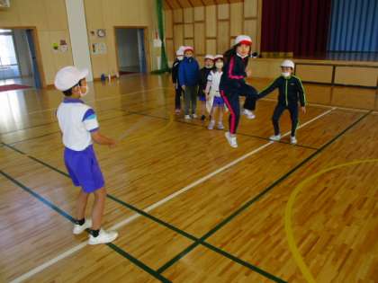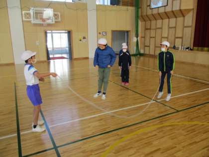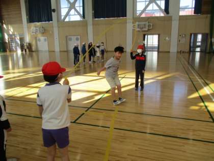 2年生の5時間目は、体育館を使った1年生と合同の体育でした。今日は長縄に取り組みました。