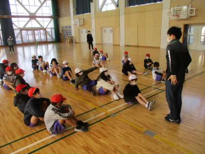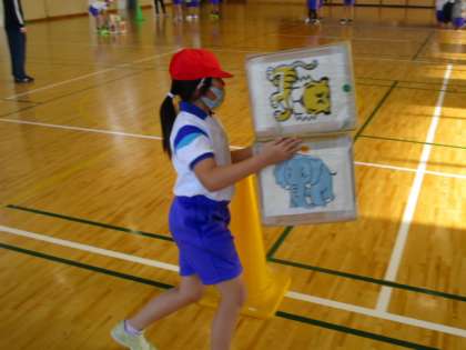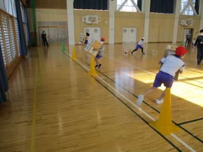 4時間目の3年生は、4年生と合同の体育でした。準備運動の後、早速3・4年生の合同班でリレーをしました。このリレーのルールがとても変わっていて、2つの段ボール箱を重ねたまま走ります。触っていいのは重ねた下の箱だけで、落とした場合にはその場で止まって拾います。とても白熱したレースでした。