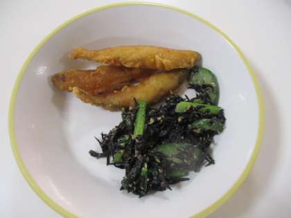 今日の給食献立は、ご飯、牛乳、わかさぎのフリッター、ひじきのごま和え、豚肉の南蛮煮、納豆 でした。