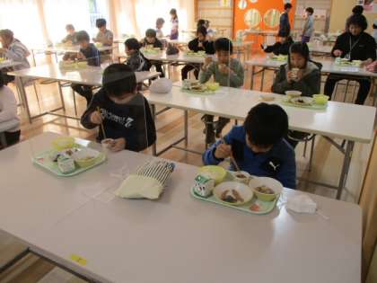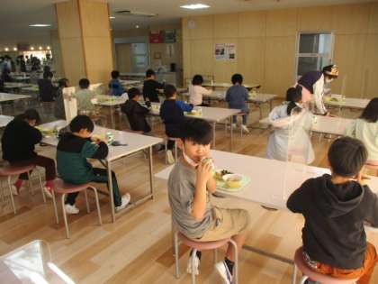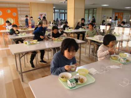 今日の給食風景です。今日のメニューに納豆が出ていましたが、納豆本体からフィルムを外し、こぼさずにタレをかけるのには苦労していました。