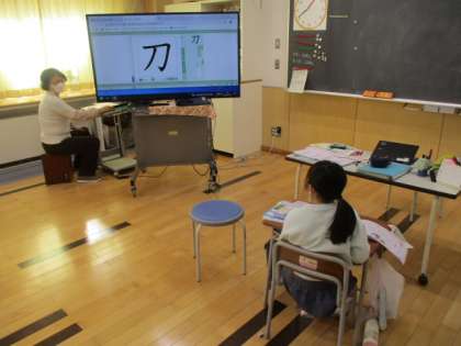 ひまわり級の2時間目は国語の授業で、漢字の学習をしました。担任の先生から、新しい漢字の読みや意味、それに書き順を教わりました。その後は練習に入りましたが、繰り返し書くことでしっかりと覚えていきましょうね。