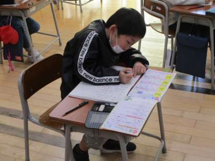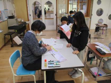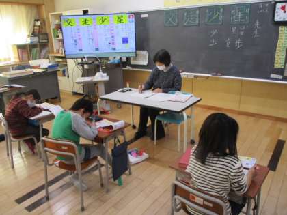 2年生の2時間目は国語の授業でした。今日の授業では、「星」「少」「走」「交」の漢字を習いました。先生から説明を受けた後に各自で練習をしますが、形が崩れていないかとか点が抜けていないかとかを先生に点検してもらいます。しっかり書けていた時に、先生から大きな丸をもらうと本当に嬉しそうです。
