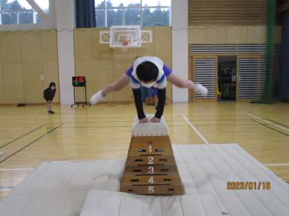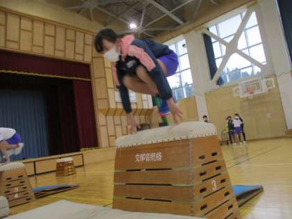 6年生も、きれいな跳び方を目指してがんばっています。できた種目については、跳び箱の高さを変えて難易度を高めていきます。