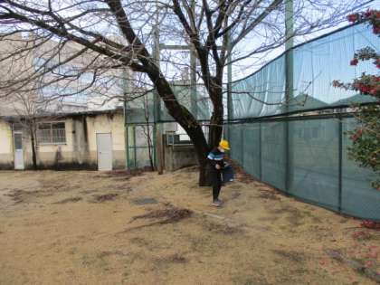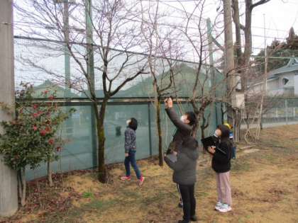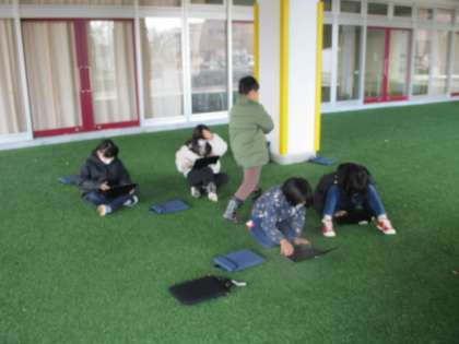 1時間目の4年生は、校舎の外に出てのフィールドワークでした。この学習は、1学期から続けている理科の観察で、各自で決めた動植物を見続けています。すっかり葉が散った植物だらけなので、中には自分の決めていた木が見つからなかった児童もいましたが、先生がもっていた便利なアプリで調べると、どの木なのかが判明しました。