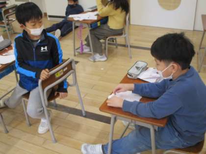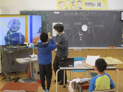 2年生の3時間目は図画工作の授業で、紙版画の顔づくりに取りかかりました。瞳以外の顔の部分はできるだけ手で切っていくので、「まゆげがむずかしい」とか「しっぱいしたので、もう1まい紙をください」という会話があちらこちらで聞こえていました。