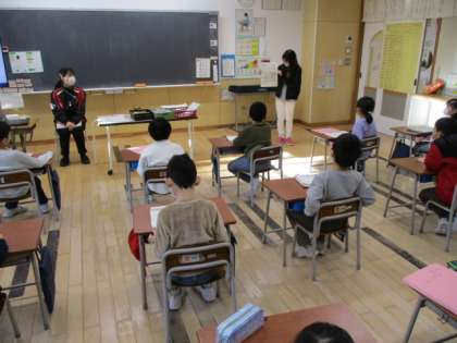 朝の時間を使って、5年生の代表数人が1・2年生の教室に何かを伝えに行きました。