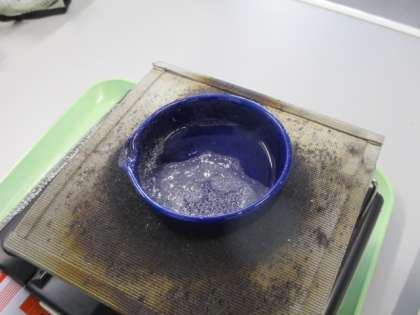 最後は、それぞれの液体を蒸発させてみます。食塩水を蒸発させた後には、食塩と思われる白い粉が残りました。