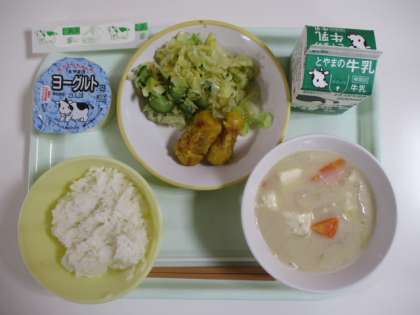 今日の給食献立は、ご飯、牛乳、ちくわのカレー揚げ、合わせ和え、豆乳汁、ヨーグルト でした。