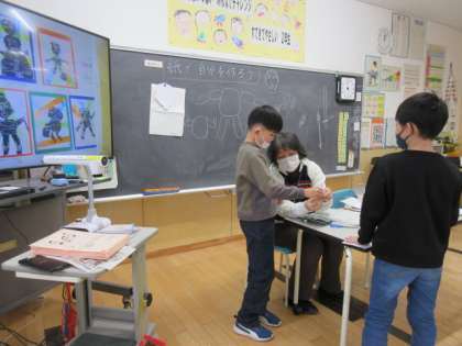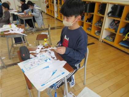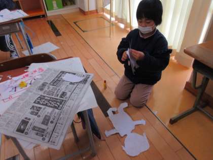 紙をちぎって組み合わせて、動きのある自分をつくっています。縄跳びや跳び箱などをしている作品が見られました。