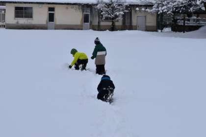 3時間目を使って、1・2年生はグラウンドに出て、合同で雪遊びを楽しみました。