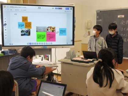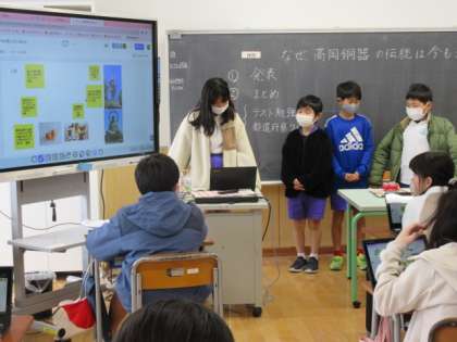 社会科では、高岡銅器の学習をしています。今日は、「なぜ高岡銅器の伝統は今も残っているのか」について、班ごとに調べたことを発表しました。4年生は、調べたりまとめたりすることがとても上手です。
