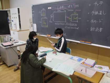 5時間目の4年生は、算数の授業でした。教室をのぞいた時には授業が一段落していて、確認のプリントに取り組んでいる児童がいたり、スキー学習のお礼状を仕上げている児童がいたりしました。