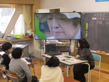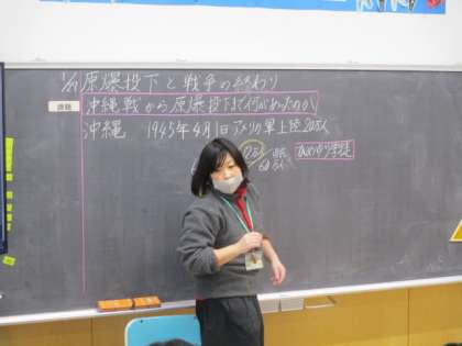 5時間目の6年生は社会科の授業で、学習内容は、沖縄戦から原爆投下までの出来事でした。学習に際しては、NHKのビデオ教材を見るなど、よりその時代が分かる工夫がなされていました。