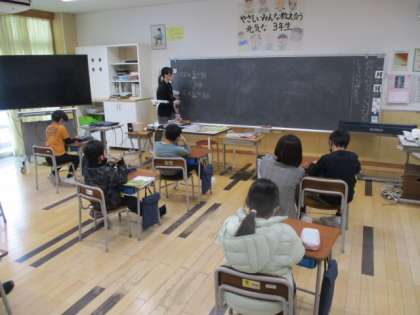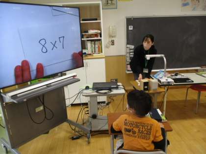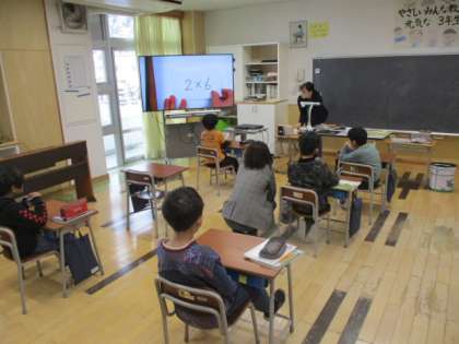 2時間目の3年生は算数の授業でした。今日の学習は、12×30といったかけ算を学習するのですが、それに先だち、フラッシュカードを使った九九の練習をしました。