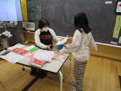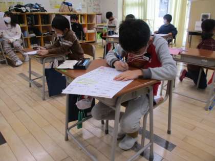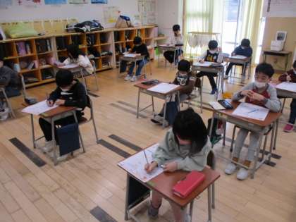 2年生の2時間目は算数の授業で、「4けたの数」の内容のカラーテストに取り組んでいました。