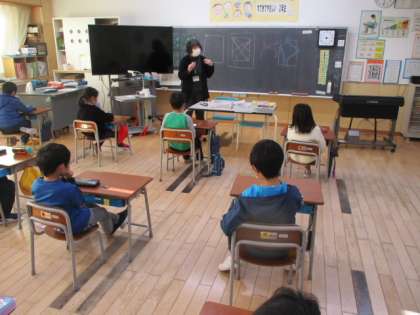 朝の時間に2年生教室を訪れると、担任の先生が1日の日程(流れ)を伝えているところでした。日程を聞いていた子供たちは、どうやら図工の版画を楽しみにしているようです。