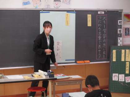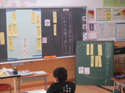 この授業では「スキー学習の思い出をつたわる言葉で表そう」という学習課題のもと、作文に取り組みます。漠然とした「楽しかった」の感想について、「何を」「どこで」「どうした」「いつ」などの「つたえるためのキーワード」を使ってどんどん広げ、豊かな表現を作っていきます。
